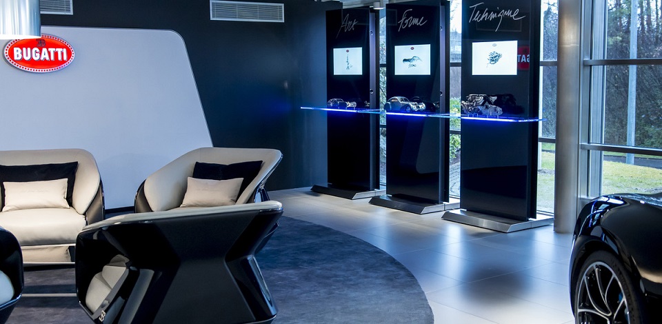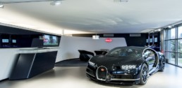 Für den hochmodernen neuen Supersportwagen von Bugatti werden Showrooms auf der ganzen Welt, von Taipeh bis New York, komplett neu installiert. Die Umsetzung des von Braunwagner entworfenen Showroom-Konzeptes sollte stilistisch anspruchsvoll, funktional und perfekt umgesetzt werden.