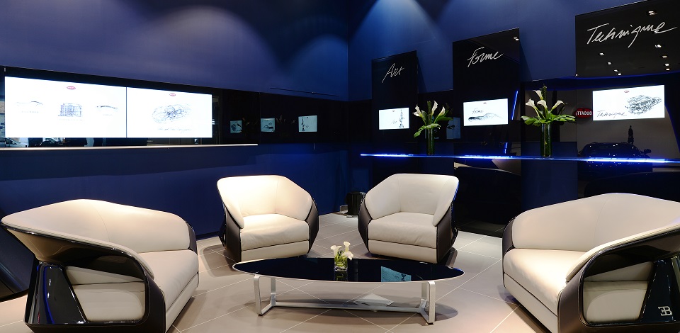 Für den hochmodernen neuen Supersportwagen von Bugatti werden Showrooms auf der ganzen Welt, von Taipeh bis New York, komplett neu installiert. Die Umsetzung des von Braunwagner entworfenen Showroom-Konzeptes sollte stilistisch anspruchsvoll, funktional und perfekt umgesetzt werden.
