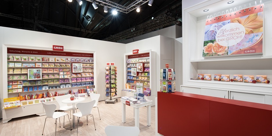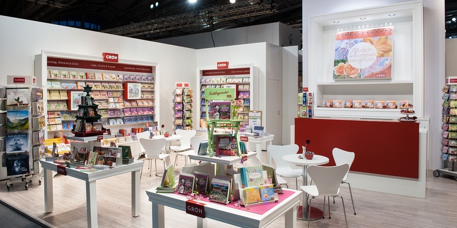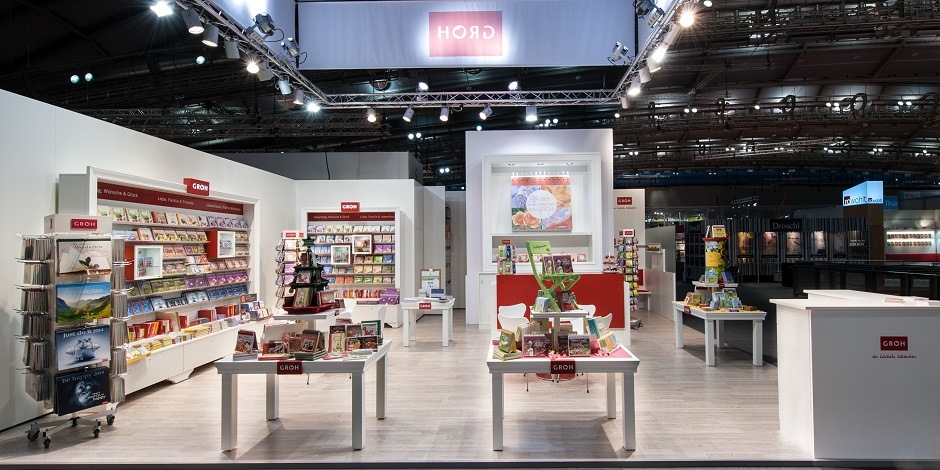 Der Groh Verlag ist Marktführer im Geschenkbuchbereich und beauftragte für den Messebau wie in den letzten Jahren raumbüro aus München. Die Herausforderung bestand darin, einen großen Messestand auf eine kleinere Fläche zu skalieren. Zu berücksichtigen war dabei der Bestand an vorhandenem Messebaumaterial, welches der Kunde in den Jahren zuvor angeschafft hatte.