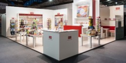 Um die Reduzierung für den Messebesucher unsichtbar erscheinen zu lassen, wurden in der Lounge die Möbel umgebaut und im offenen Bereich auf Tische verzichtet. Somit hat sich der Kunde seinen Messestand erhalten. Die angefallenen Umbaumaßnahmen fielen nicht ins Gewicht. So funktioniert effizienter Messebau.