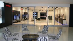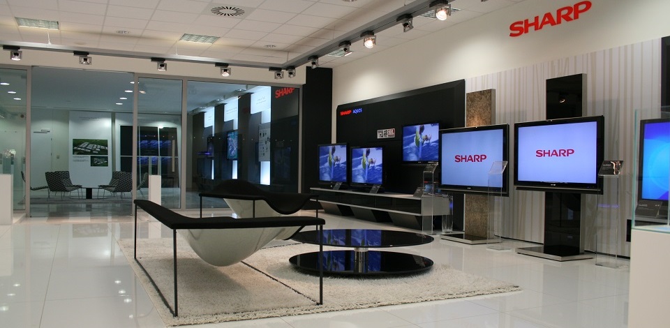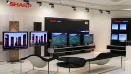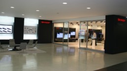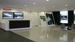 Im Eingangsbereich der neuen Fabrik sollten verschiedene Produkte von Sharp präsentiert werden. In einem geschlossenen Bereich wurde das neue Shopsystem mit diversen LCD Fernsehern gezeigt. Nebenbei gab es Informationen über LCD Monitore sowie Sharp Kopierer.